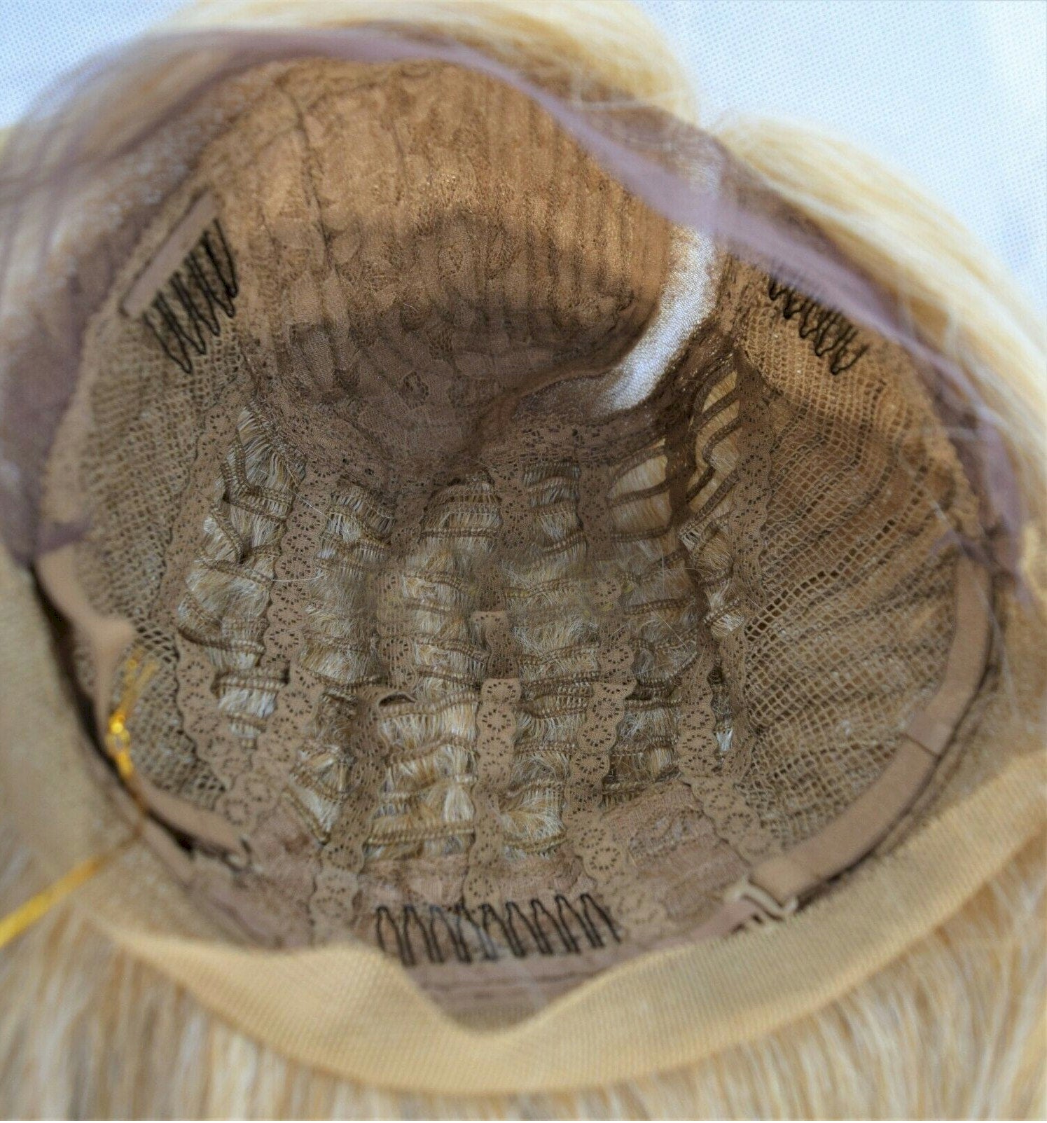 It is made out of deluxe synthetic fiber and is a very high quality wig with adjustable size inner straps to fit the size of your head and good quality cap with center Part.