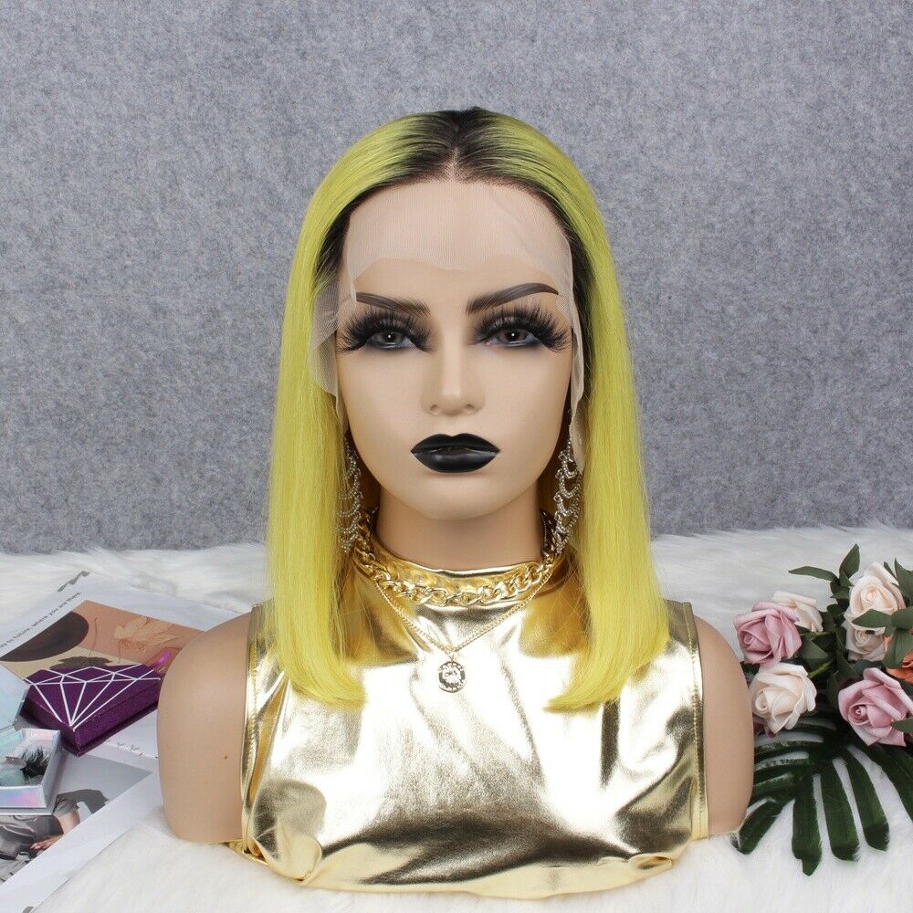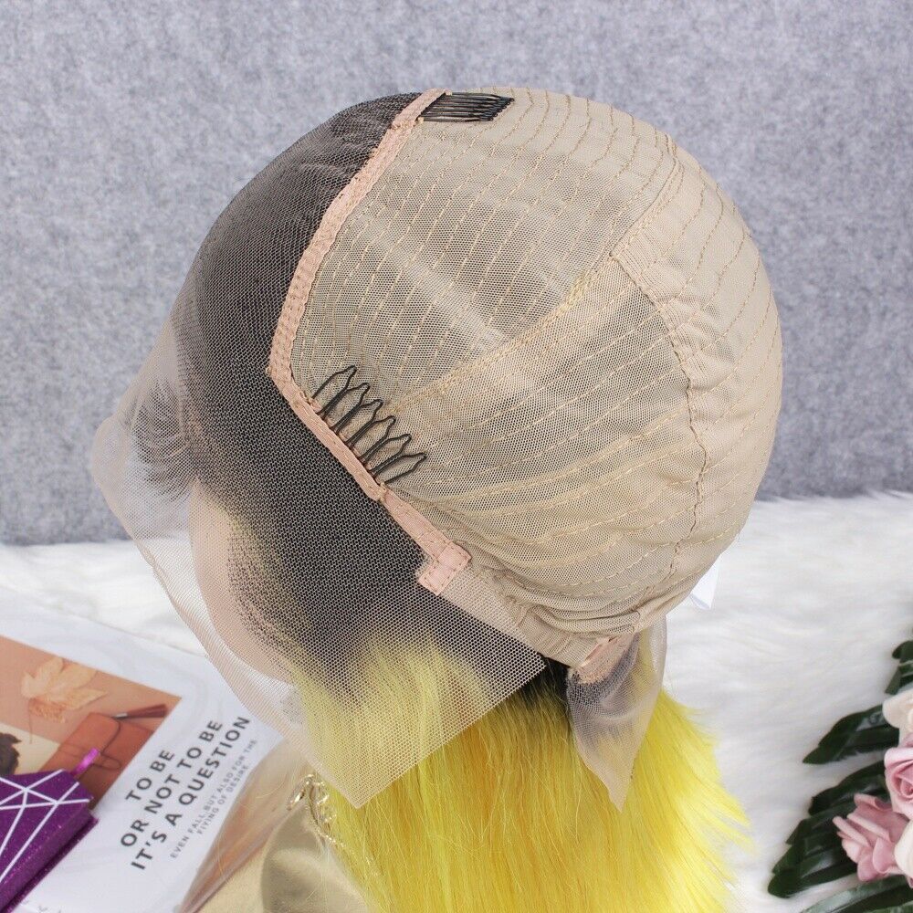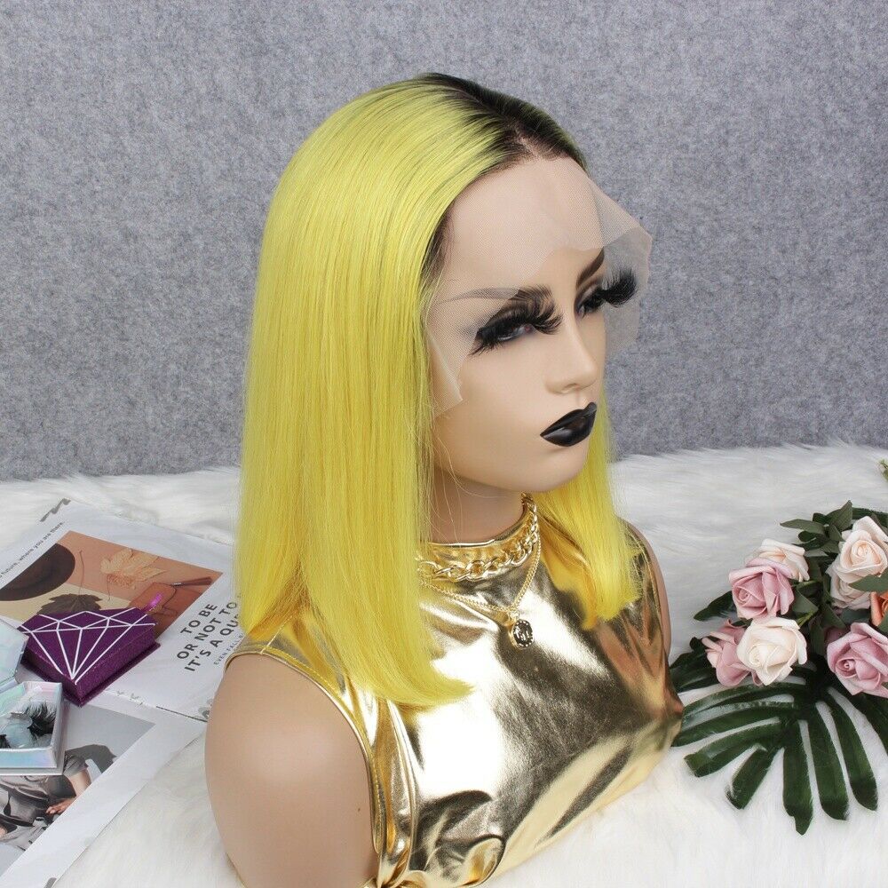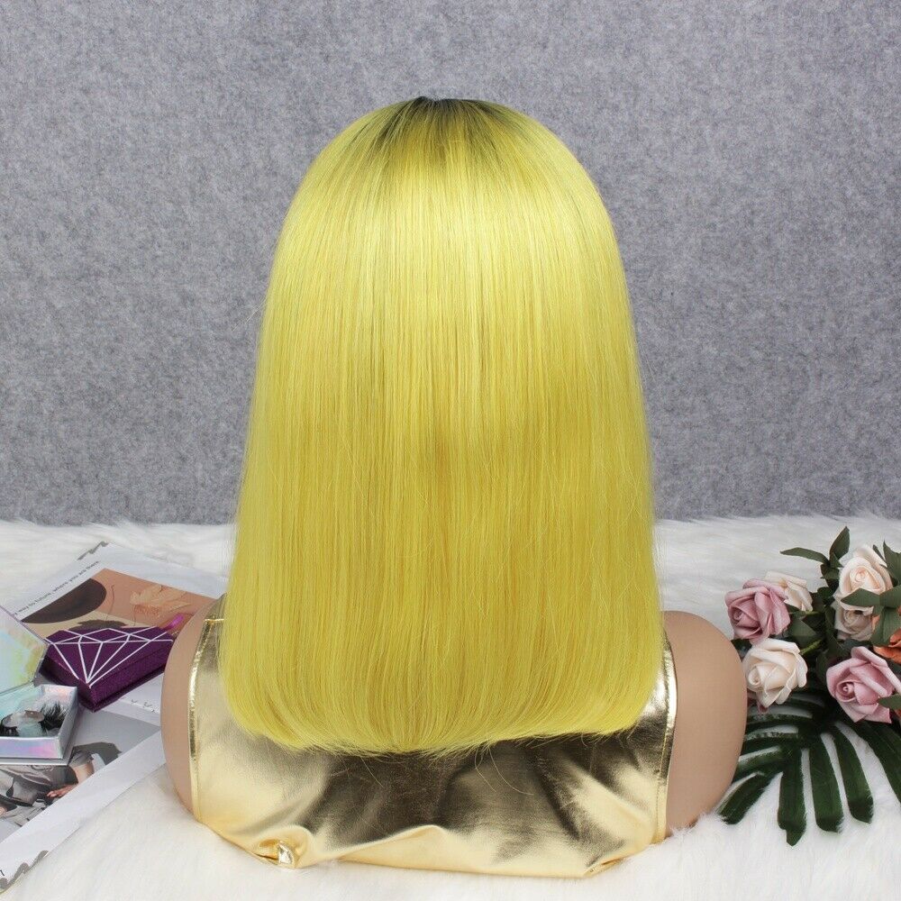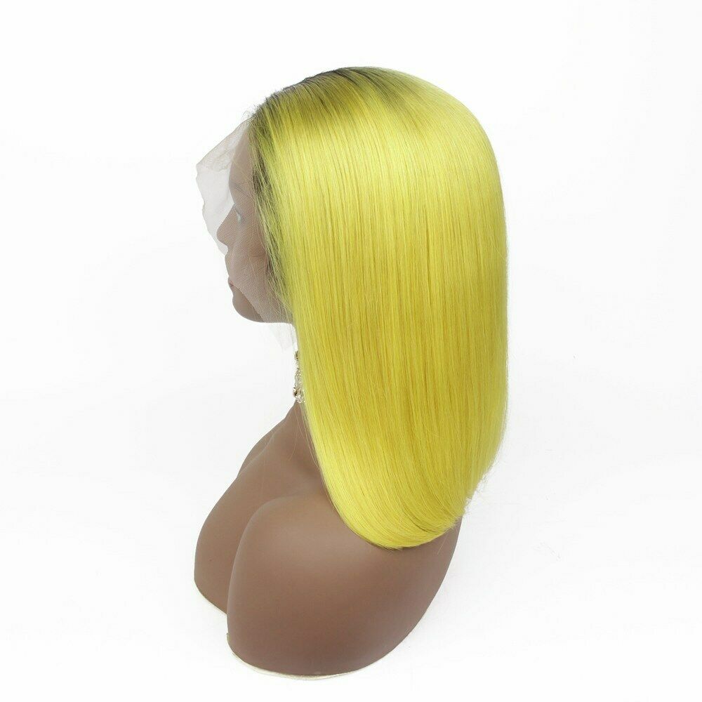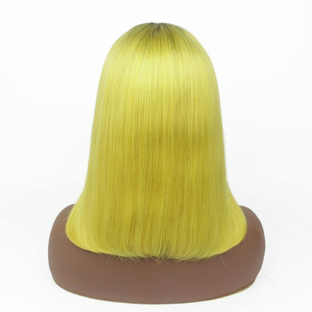 100% Human Hair TRANSPARENT Lace Front Bob Wig 180% Density Yellow Color 14"