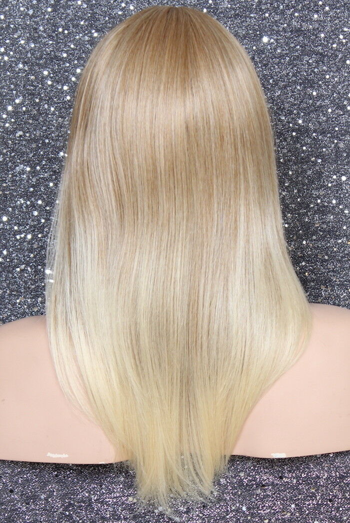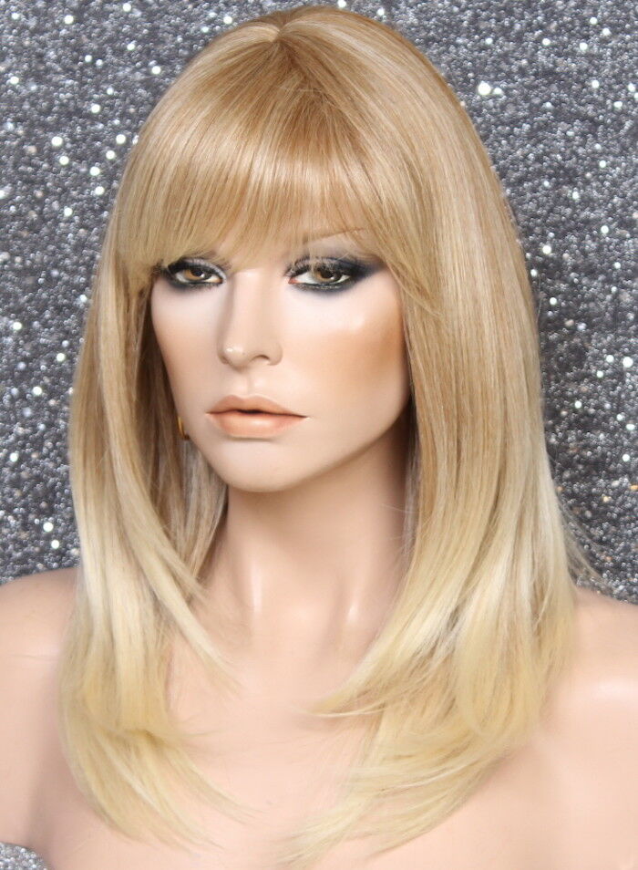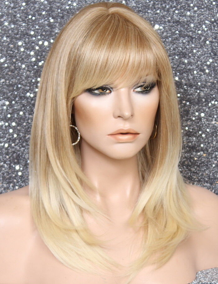 Synthetic, Full Wig Layered Straight bangs Heat OK Blonde Mix