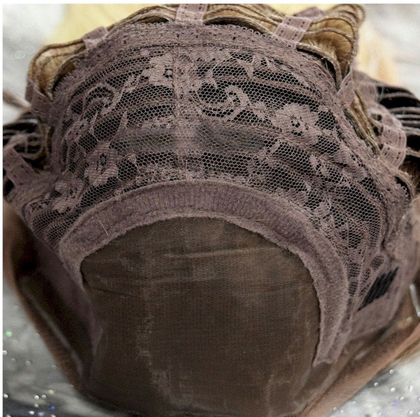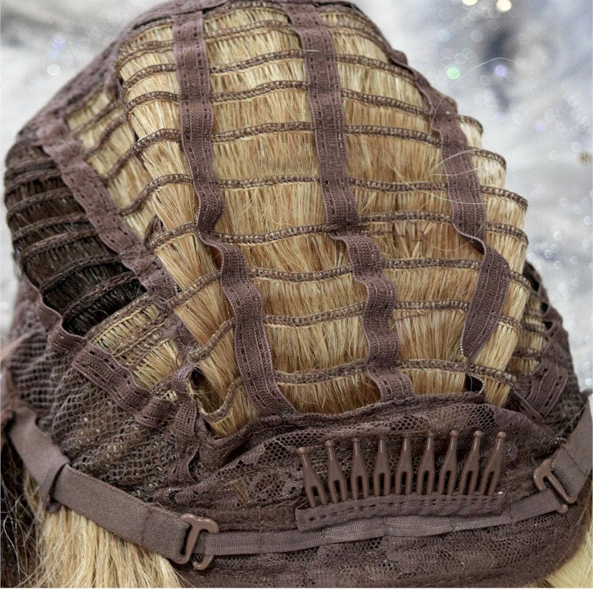 Hair is hand-tied on the front lace part and sewn on the adjustable light-netting cap. The adjustable light-netting cap with 2-3 short combs attached in the front and 1 short comb in the nape or sides to provide a more secure wearing. All you should need to do is adjust the hooks inside the cap to the correct size to suit your head. No Pins or Tape should be required.