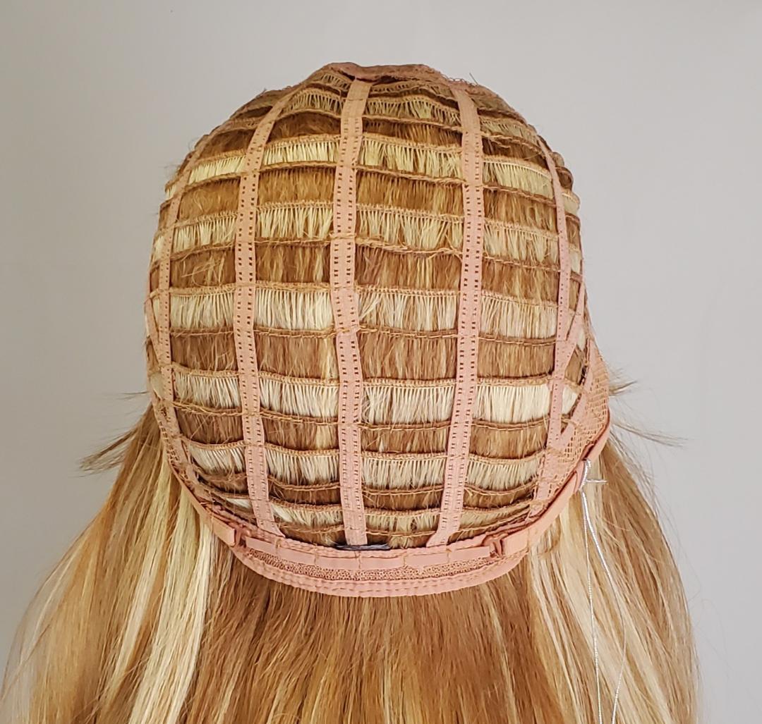 Hair is hand-tied on the front lace part and sewn on the adjustable light-netting cap. The adjustable light-netting cap with 2-3 short combs attached in the front and 1 short comb in the nape or sides to provide a more secure wearing. All you should need to do is adjust the hooks inside the cap to the correct size to suit your head. No Pins or Tape should be required.