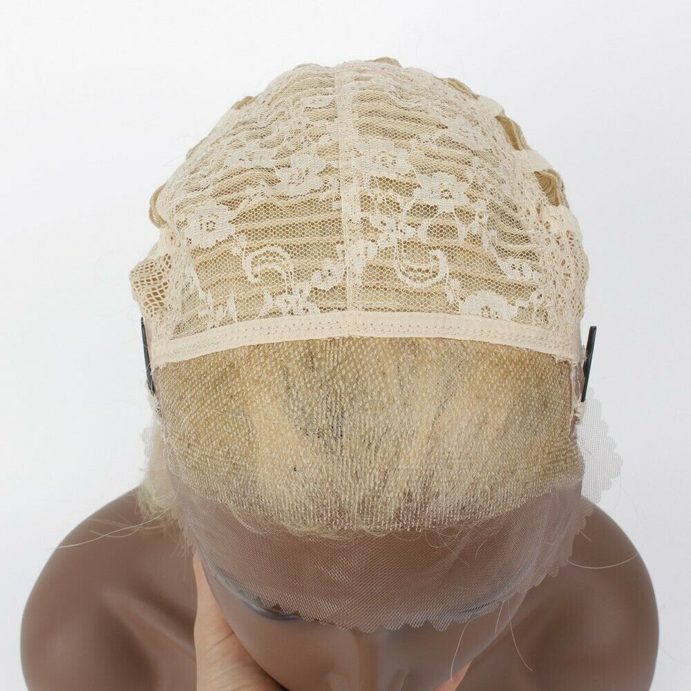 A Lace Front wig offers the most realistic natural looking hairline. Individual hairs are hand tied onto the lace, giving the impression of natural hair growth. Trim lace as needed. Apply lace with bonding glue or lace front tape and finished off with foundation and cosmetic powder.